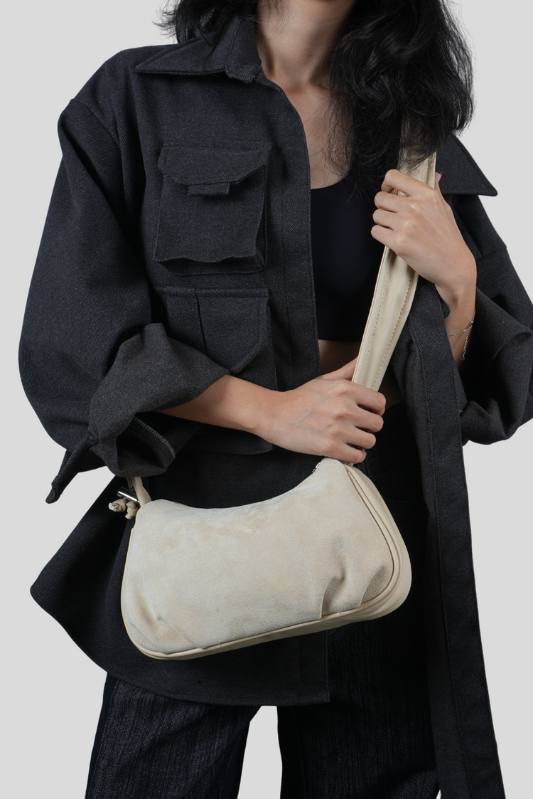The CLOUDSTRETCH SHOULDER BAG is what happens when futuristic softness meets urban edge. With its unique scrunched strap design and pillowy silhouette, this bag carries both statement and subtlety. The body is wrapped in luxe faux suede while the padded, ruched strap adds a sculptural touch to your daily rotation. Designed for motion, it features an adjustable shoulder strap integrated with functional drawstring detailing — so you control the drop, the shape, and the vibe. It's minimal, it's bold, and it's built to move.