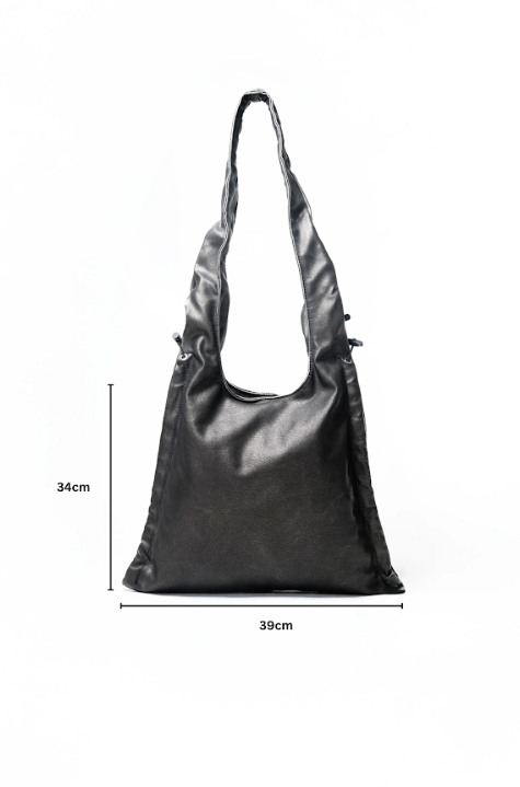 With a fixed, broad shoulder strap and top zip opening, this piece fuses brutalist edge with stealthy function — no frills, just raw impact.