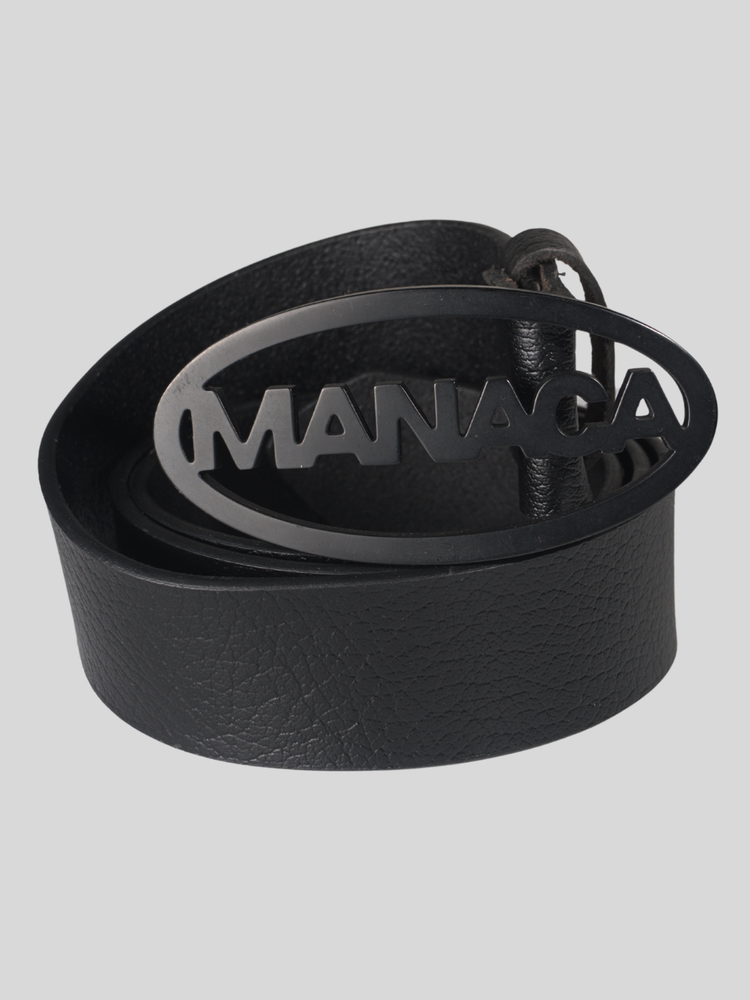 Unisex belt crafted from pull-up leather; the cut-out buckle is cast in the shape of the iconic Oval logo and features a three-dimensional metallic finish.