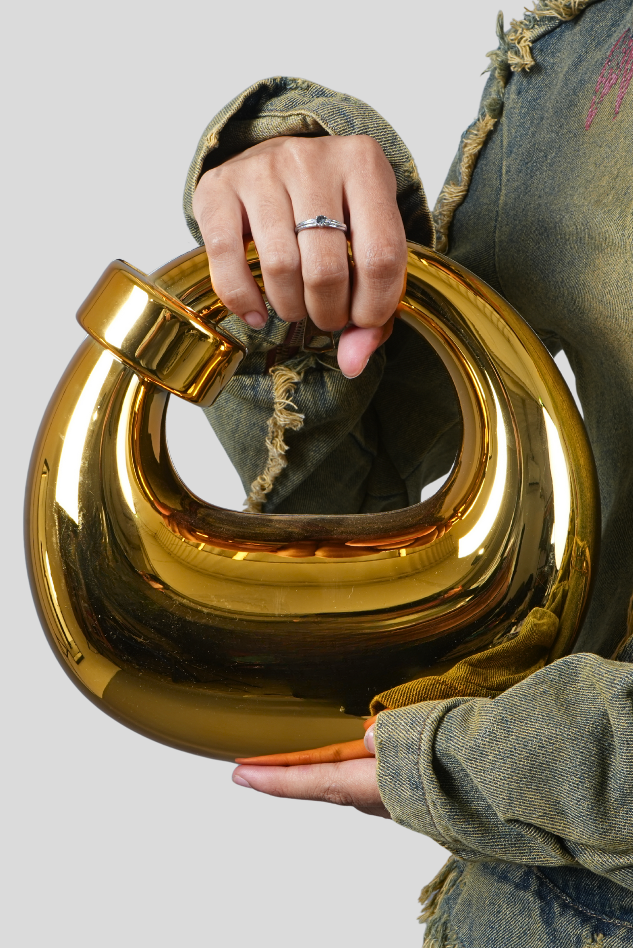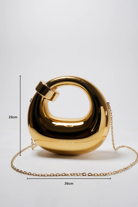 The MANACA Solaris Orb Bag is pure liquid gold energy — a futuristic icon that redefines luxury streetwear. Its sculptural circular form glows with a high-gloss metallic finish, designed to catch light and command presence. The integrated handle curves seamlessly into the body, balanced with a detachable chain strap for versatile styling. A bold fusion of art and accessory, the Solaris Orb is crafted for those who live unapologetically in the spotlight.