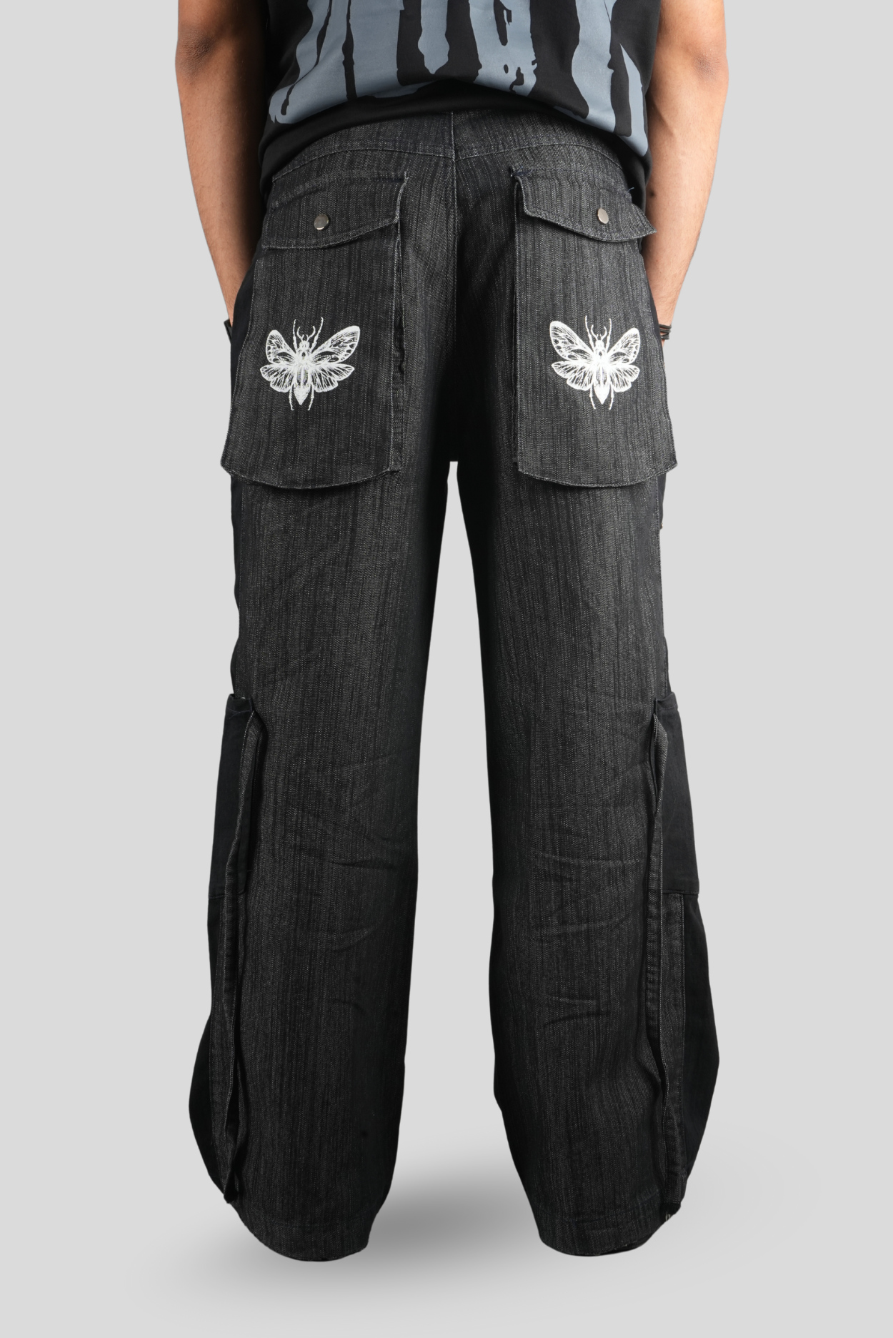 The MOTH GAME Cargo Pants fuse utility with artistic expression, creating a standout piece that blends workwear aesthetics with modern streetwear. Designed with a functional side loop reminiscent of traditional carpenter jeans, these cargos pay homage to classic craftsmanship while adding a unique urban edge. The whimsical moth print on the back pocket adds a touch of individuality, while the five rivets on each side enhance durability and structure, contributing to their bold, industrial-inspired appeal. With a loose fit for comfort and movement, these pants are the perfect fusion of practicality and artistic vision.