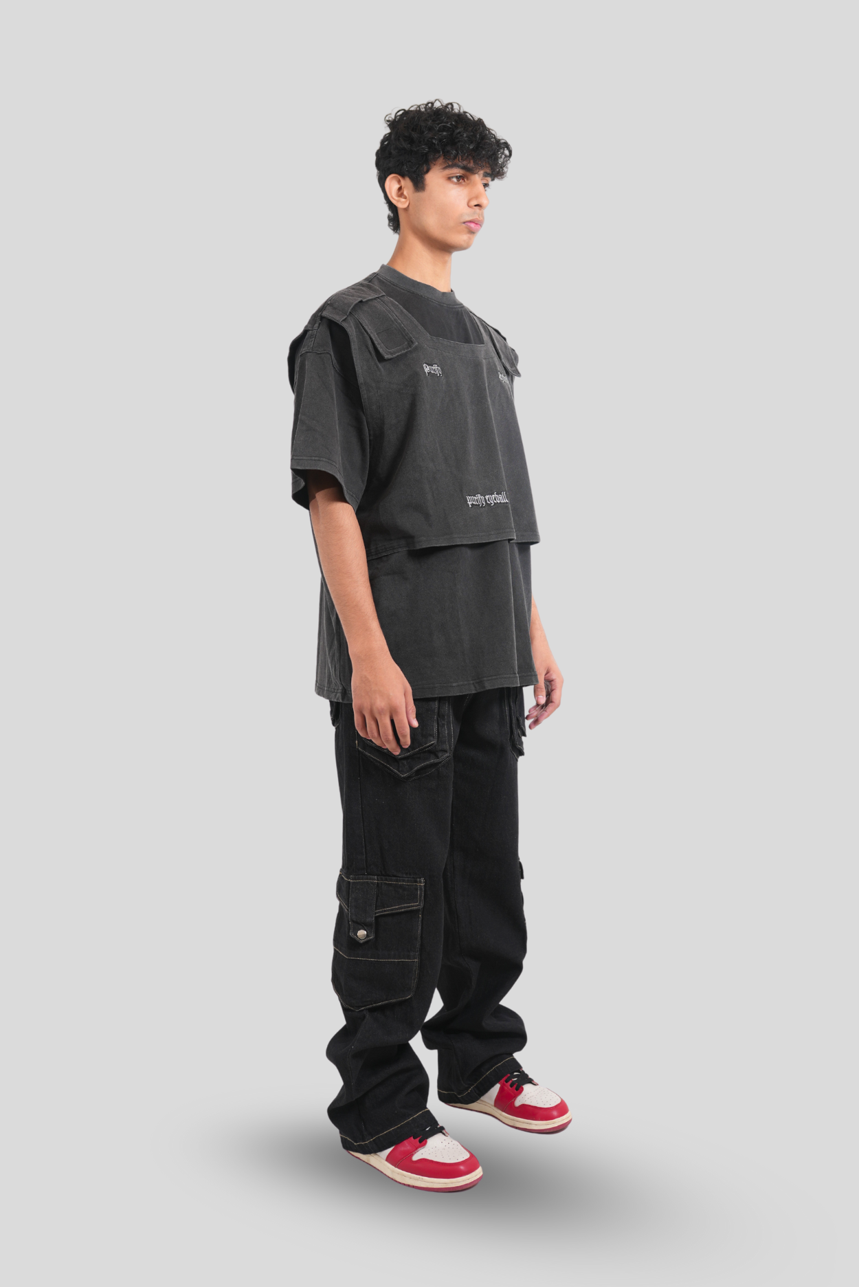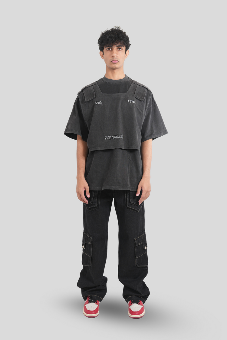 Bulletproof by design. No exit wounds. The PUFFZUP TEE is built like a street soldier’s second skin — no gimmicks, just raw structure. Featuring a non-detachable layered chest flap that mimics tactical armor, this heavyweight washed-black tee delivers serious body-vest energy. Embroidered gothic lettering — Purify, Eyeball, and J13 — hits across the chest, hem, and back with precision stitching. With shoulder tab details and a worn-in finish, this tee isn’t for flex — it’s for domination.